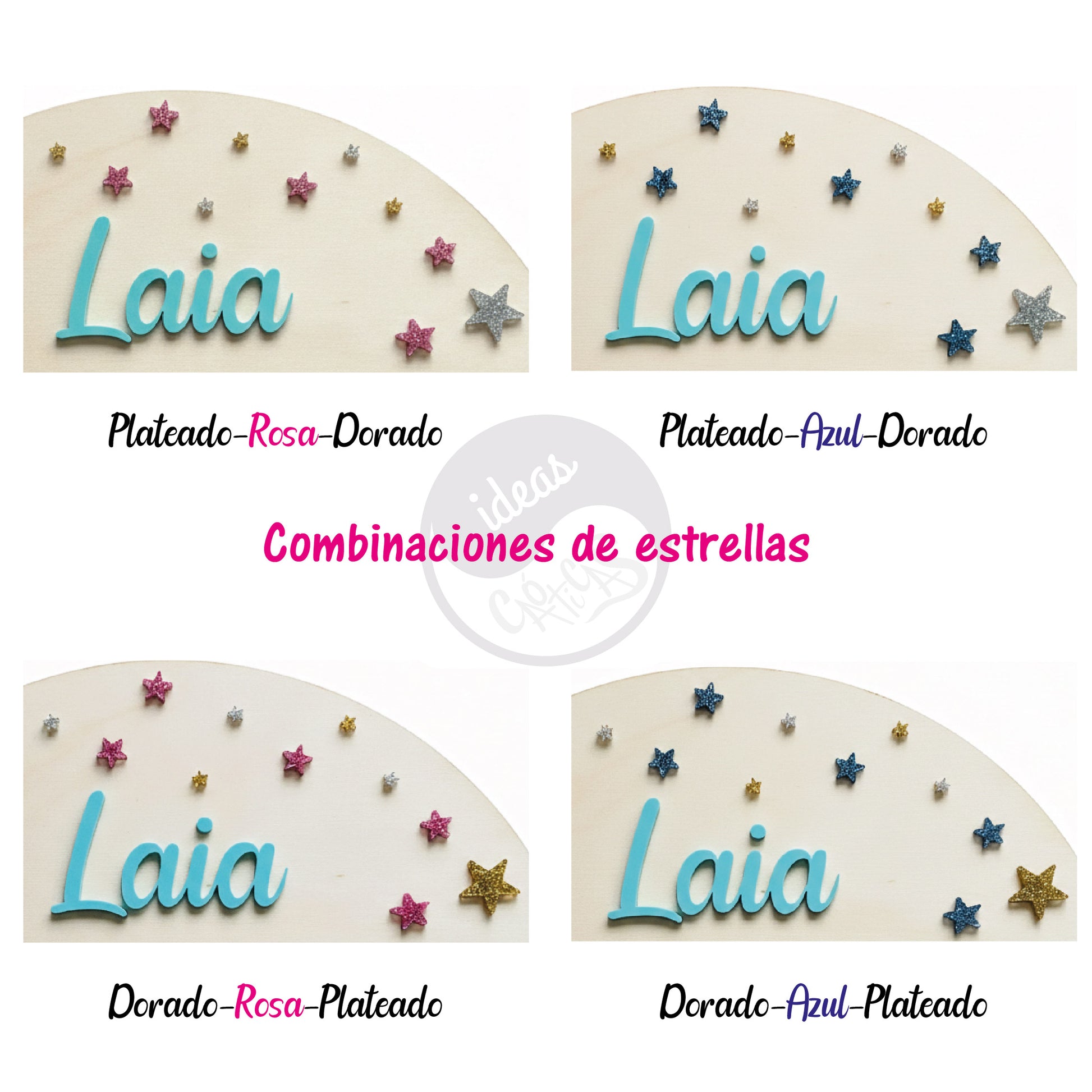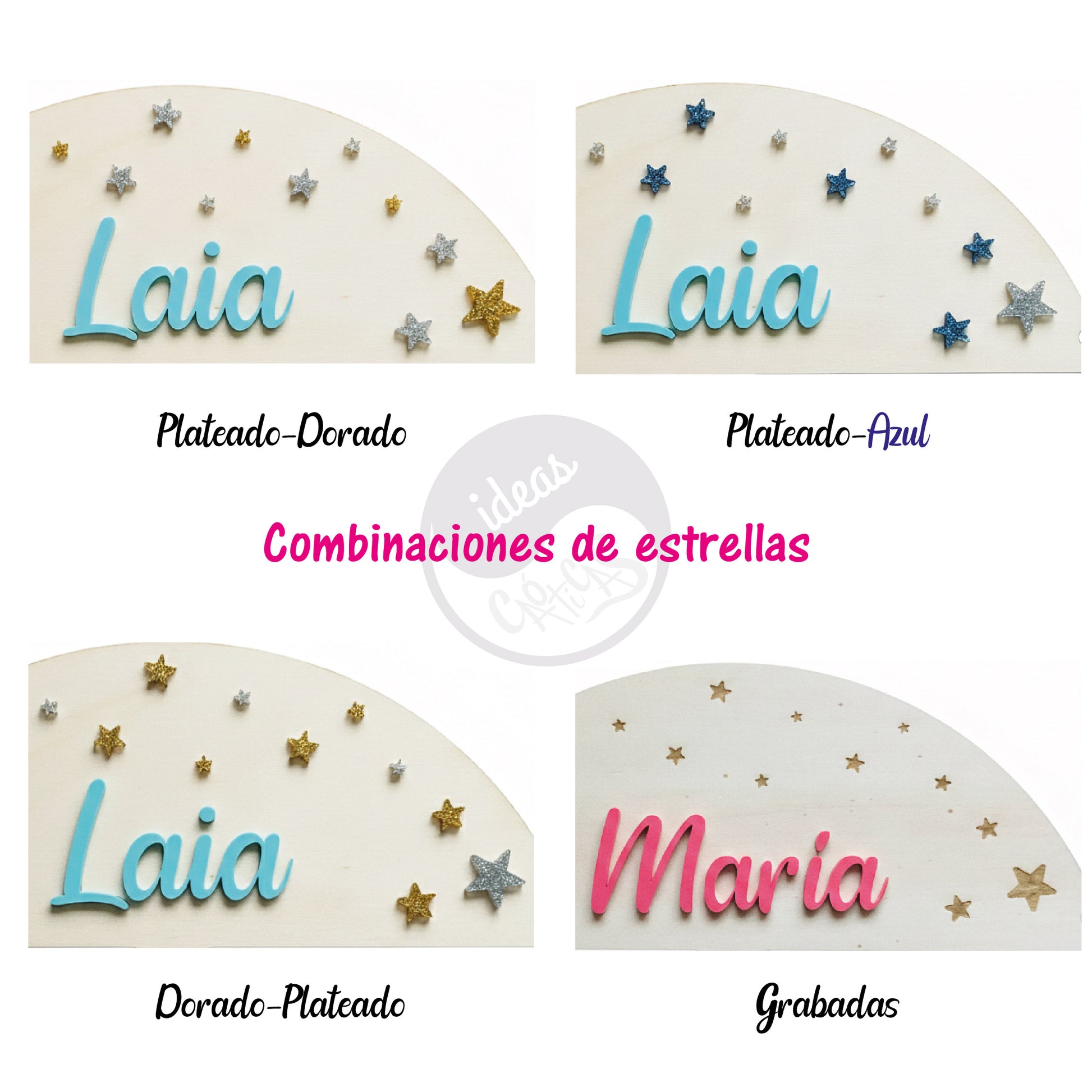 Personaliza el nombre, la figura y las estrellas en acrílico del color que elijas. Se incluyen tacos y tornillos para su instalación.